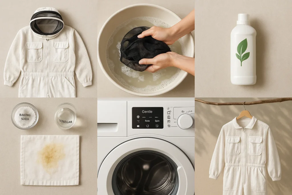 Start by reviewing the manufacturer’s care instructions. At GoldenHiveGears, we recommend gentle washing for all of our suits, especially those with structured veils or mesh inserts.