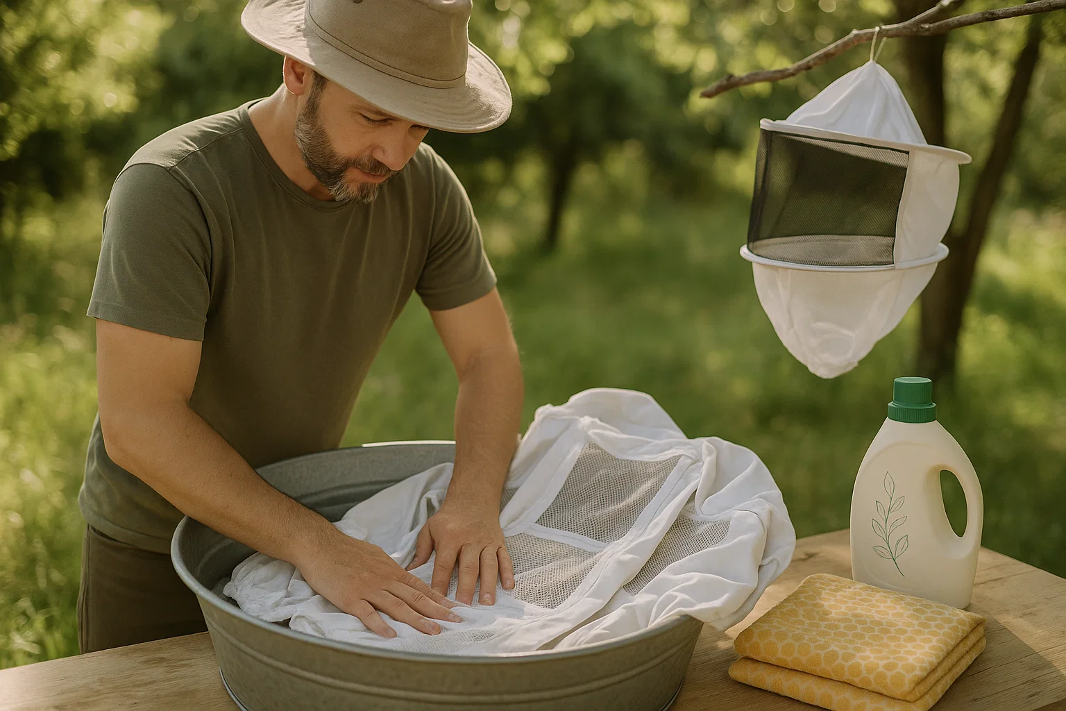 Start by reviewing the manufacturer’s care instructions. At GoldenHiveGears, we recommend gentle washing for all of our suits, especially those with structured veils or mesh inserts.