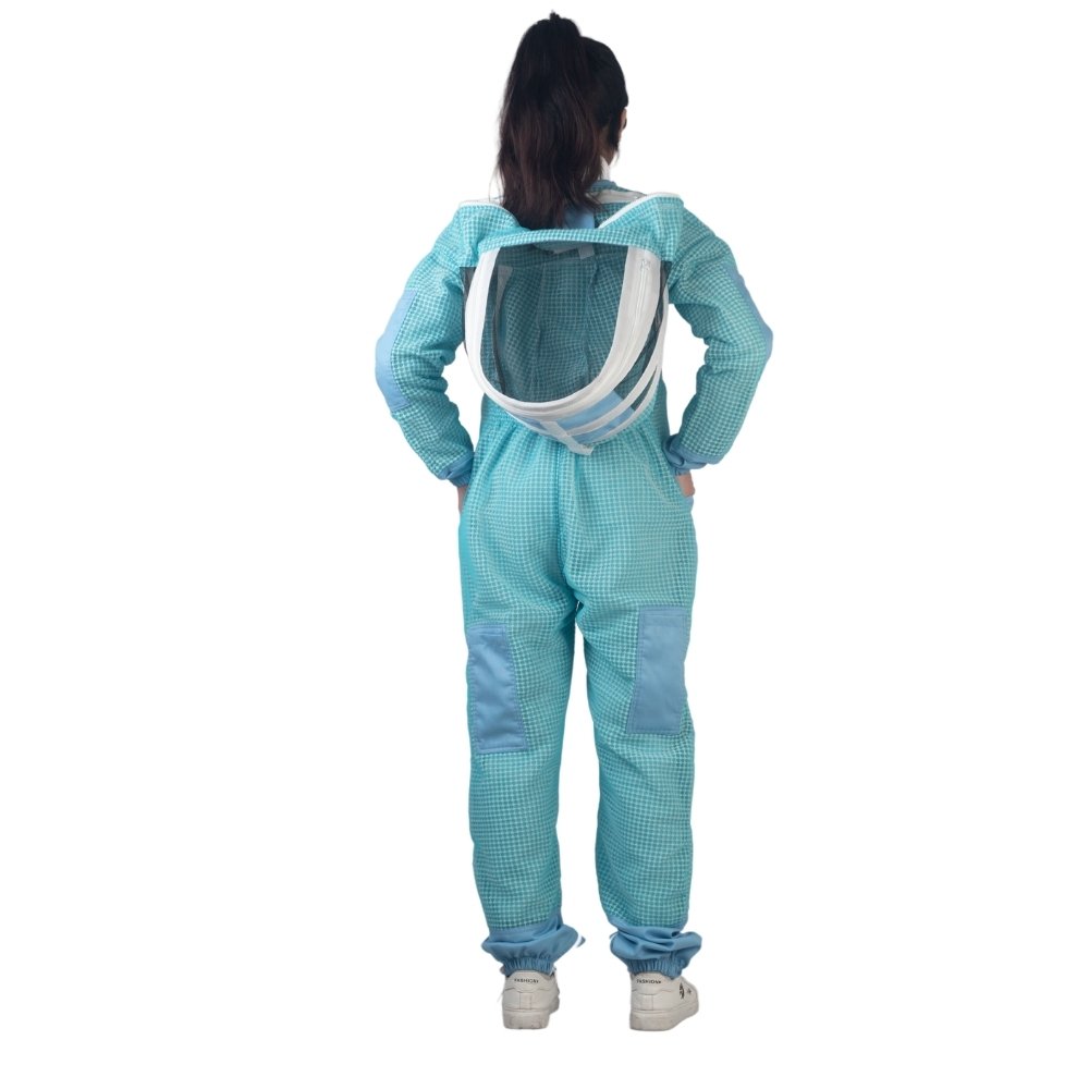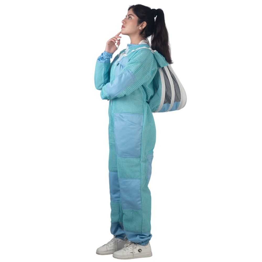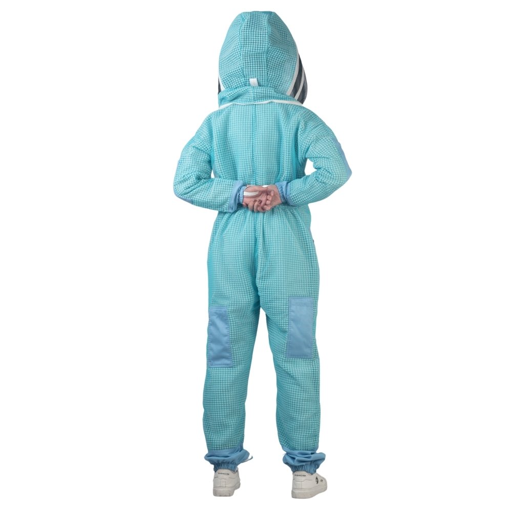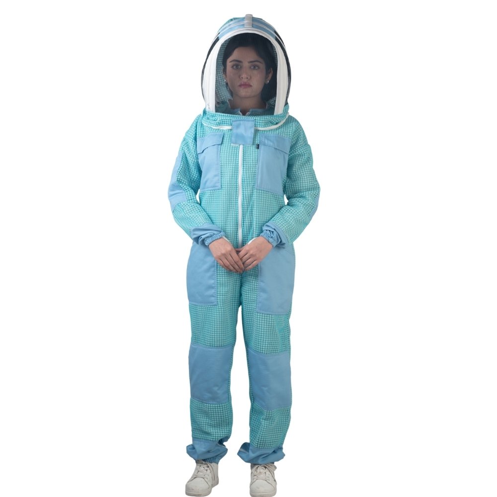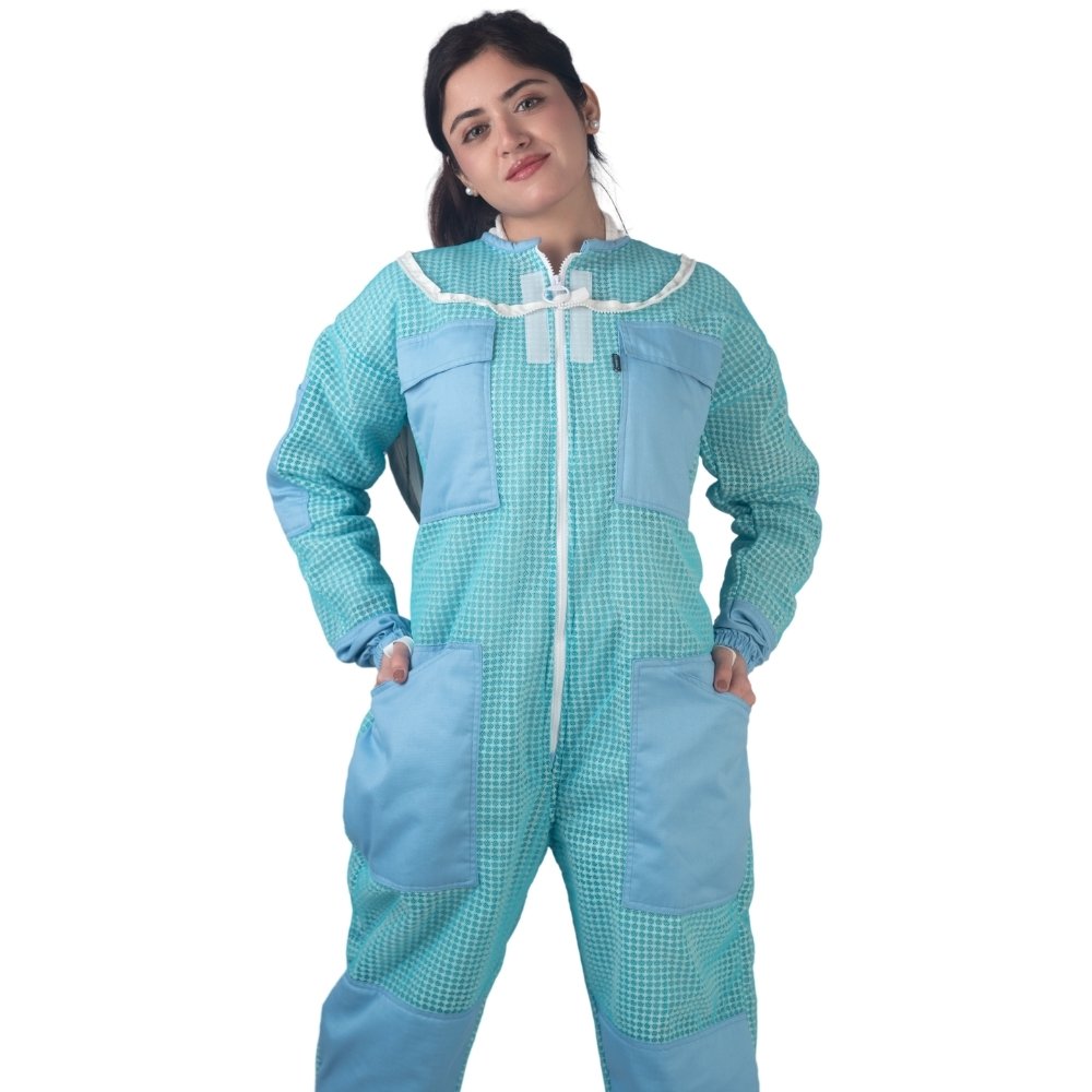 The Aeris Blue Ventilated Bee Suit is built as a single-piece suit that combines full-body coverage with practical detailing. With its front zipper, multiple pockets, reinforced areas, elasticated cuffs, and structured veil system, it offers a balanced and functional design suitable for beekeeping tasks.