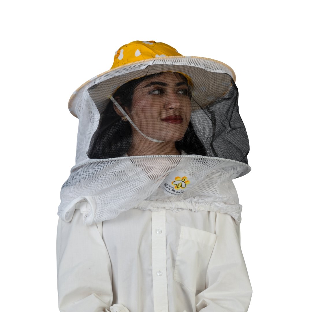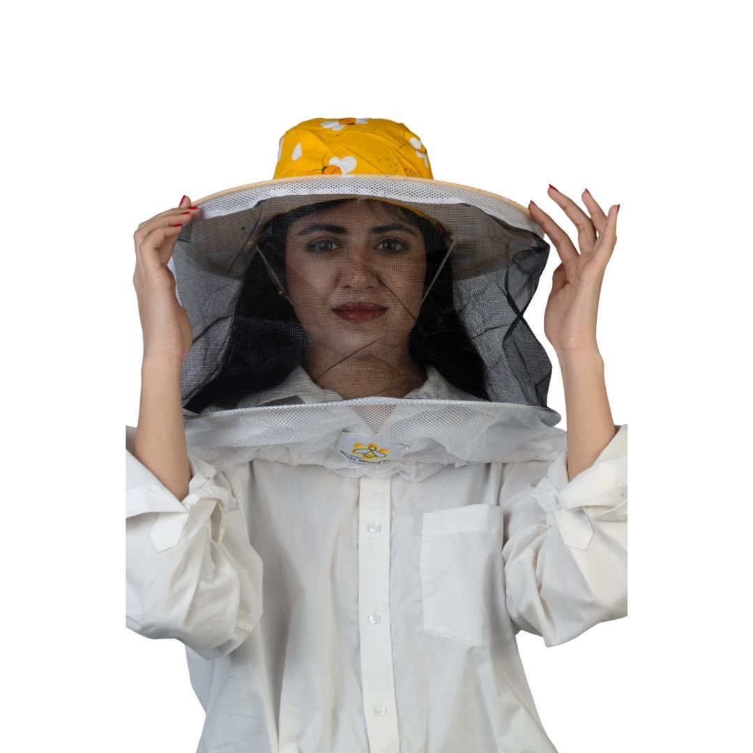 At GoldenHiveGears, we present the FloraGuard Beekeeping Veil — a structured headwear design featuring a printed yellow crown, wide circular brim, and a full 360° mesh enclosure. Its balanced construction and reinforced mesh frame create a stable protective form around the face and neck area.