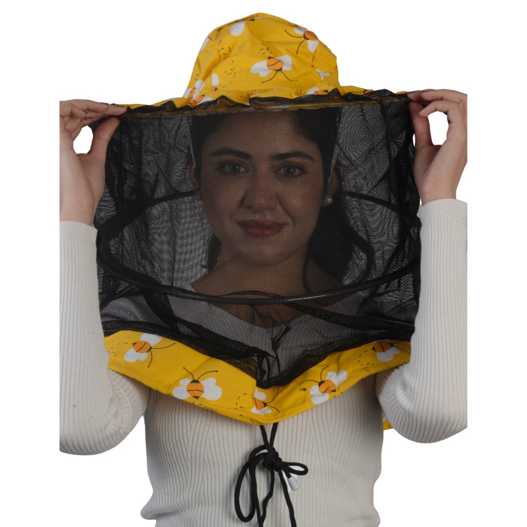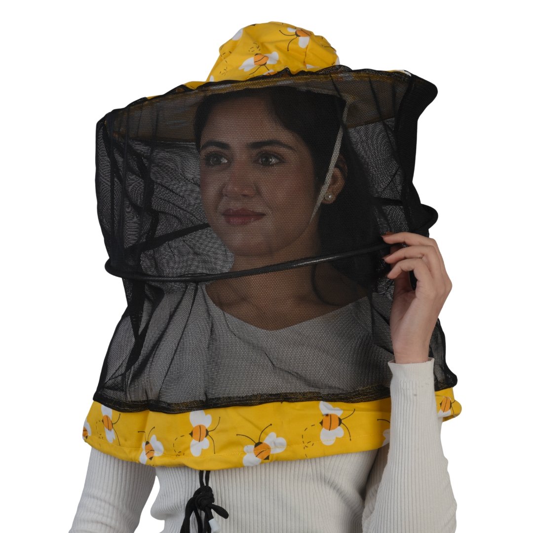 At GoldenHiveGears, we introduce the HoneyGuard Mesh Veil — a structured beekeeping headwear design featuring a printed yellow crown, wide circular brim, and a fully enclosed 360-degree mesh veil system. Its balanced structure and reinforced mesh frame create a stable protective form around the face and neck area.