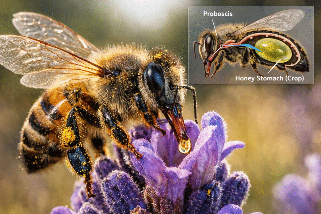 Instead of digesting the nectar, the bee stores it in a separate organ called the honey stomach (or crop). This allows transport back to the hive without metabolizing the sugars.