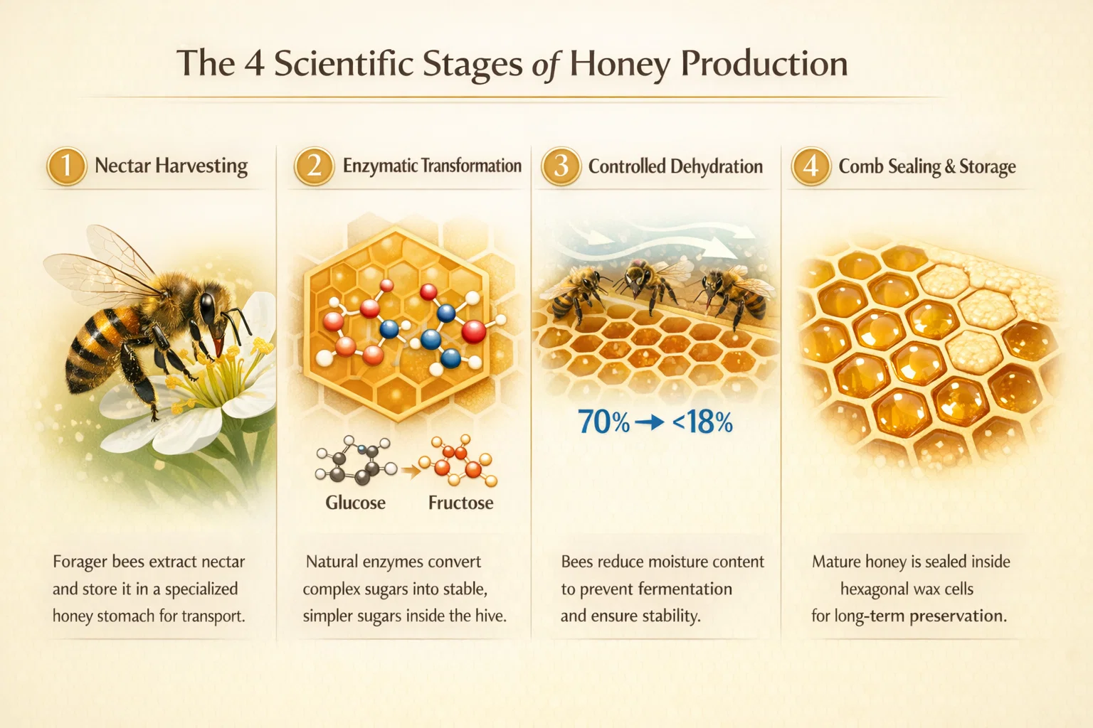 Honey production is an extraordinary example of biological precision and collective coordination. From nectar collection to enzymatic refinement and moisture control, each stage demonstrates the sophistication of honeybee colonies.